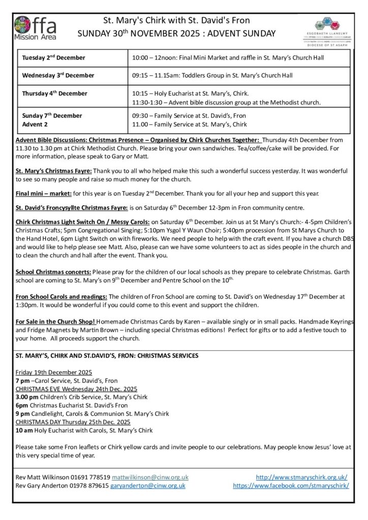 As well as the notices please find the reading sheet and December prayer diary attached.