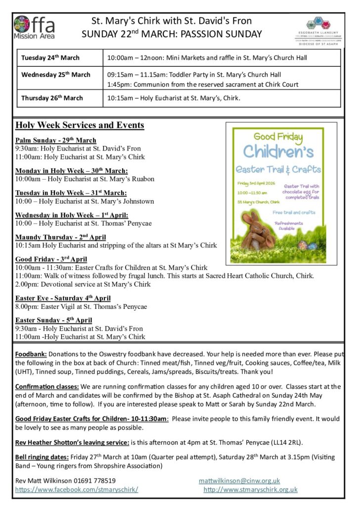 I attach our weekly notices which include all our Holy Week Services.