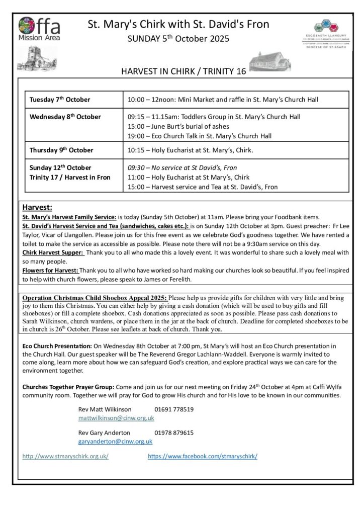 Today we celebrate Harvest in Chirk and Trinity 16 in Fron.